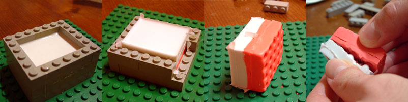 Die vorbereitete Urform wird auf eine gewöhnliche beschichtete Platte geleimt. Damit keine Silikonmasse unter die Urform läuft, wird diese sorgfältig mit Leim abgedichtet. Der noch frische überschüssige Leim wird sofort wieder abgewischt. Der Rahmenbau ist relativ einfach mit Holzleisten zu bewerkstelligen, die mindestens 0,5 cm höher als die höchste Stelle der Urform sind. Auch Legosteine sind als Wandung durchaus geeignet. Sollten Stellen des Rahmens nicht dicht sein, kann mit gewöhnlicher Knetmasse (hier blau) abgedichtet werden. Besondere Mühe braucht man sich beim Rahmenbau nicht geben, da dieser normalerweise nur einmal verwendet wird.